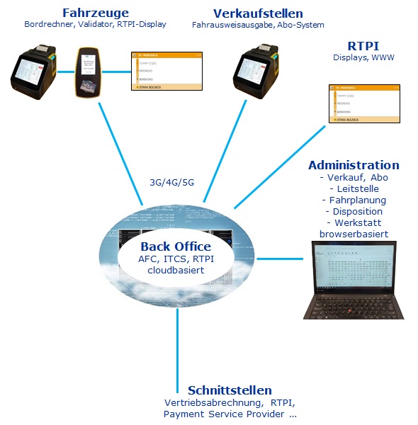 Über das ITCS erfolgt die Kommunikation zur Leitstelle und es werden die RTPI-Displays in den Fahrzeugen angesteuert. Die Kommunikation zum Back Office erfolgt über mobilen Datenfunk.