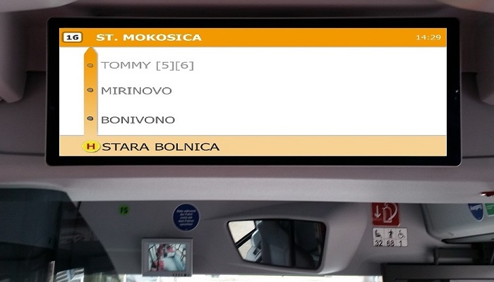 The vehicle computer interfaces to on-board displays, both inside and outside. The displays can show lines, desitinations and also real-time passenger information.